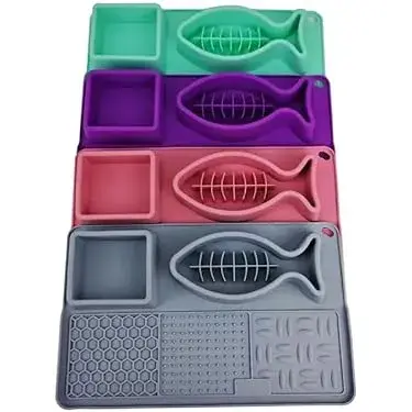سجادة التغذية. أكواب الشفط في الخلف تثبت الأرضية بإحكام وتمنع السجادة من الانزلاق أثناء لعق كلبك. تعمل أكواب الشفط على معظم الأسطح الملساء مثل الزجاج والبلاط الخزفي والأرضيات وأحواض الاستحمام والثلاجات ولكنها لا تعمل على الأسطح المركبة الخشبية. سهلة التنظيف وآمنة للاستخدام في غسالة الأطباق والفريزر.