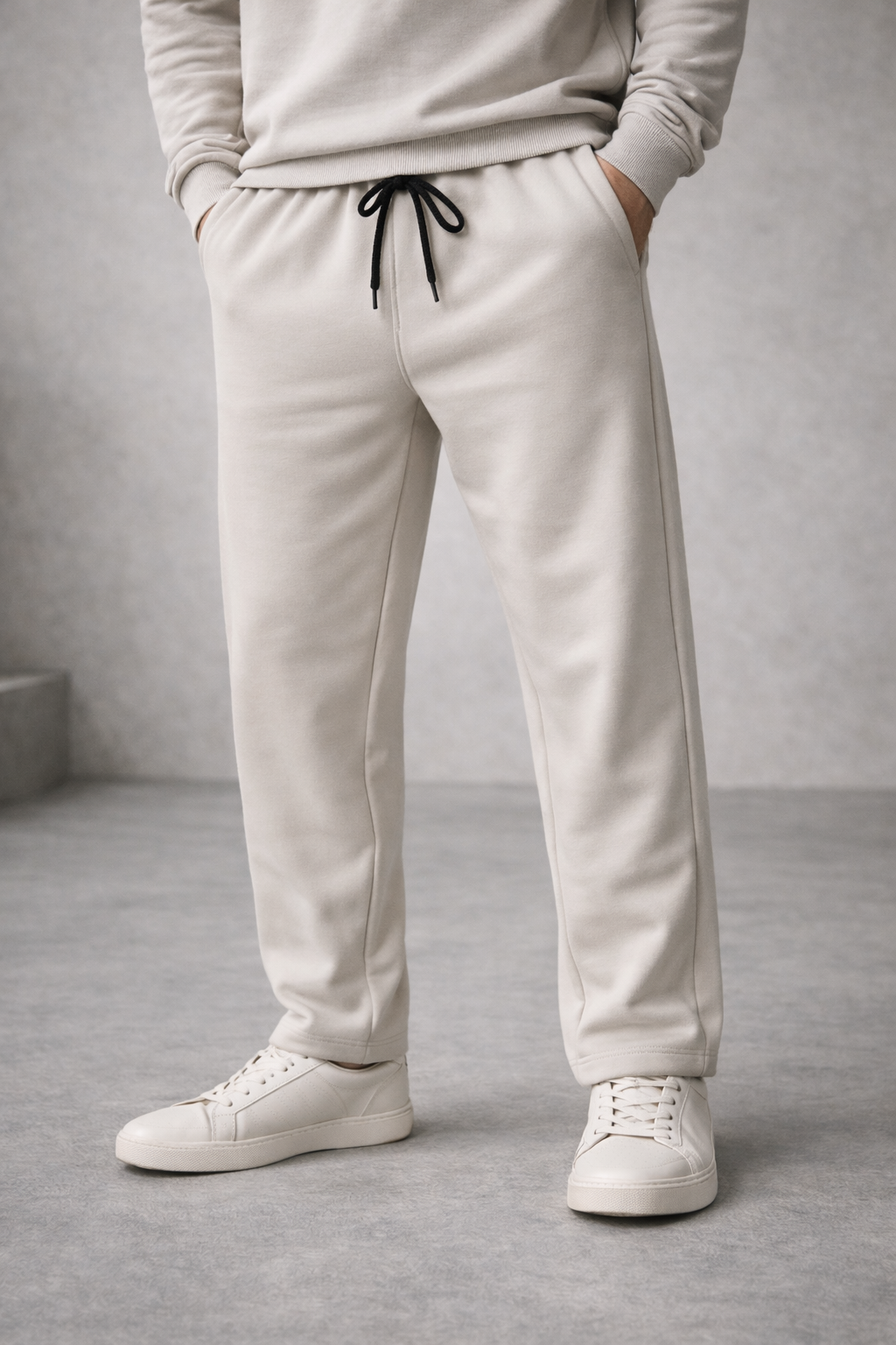 Premium jogger sweatpants crafted from thick cotton fleece fabric with a smooth matte finish. Designed with a relaxed regular fit that stays comfortable through the hips and thighs, then naturally tapers toward the ankle for an everyday clean silhouette. Features an elastic waistband with a visible black drawstring, angled side pockets, and a minimalist straight-leg finish with no ankle elastic. Perfect for casual wear, lounging, or streetwear styling in cooler seasons.