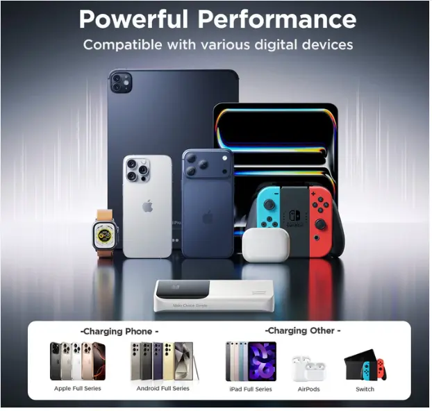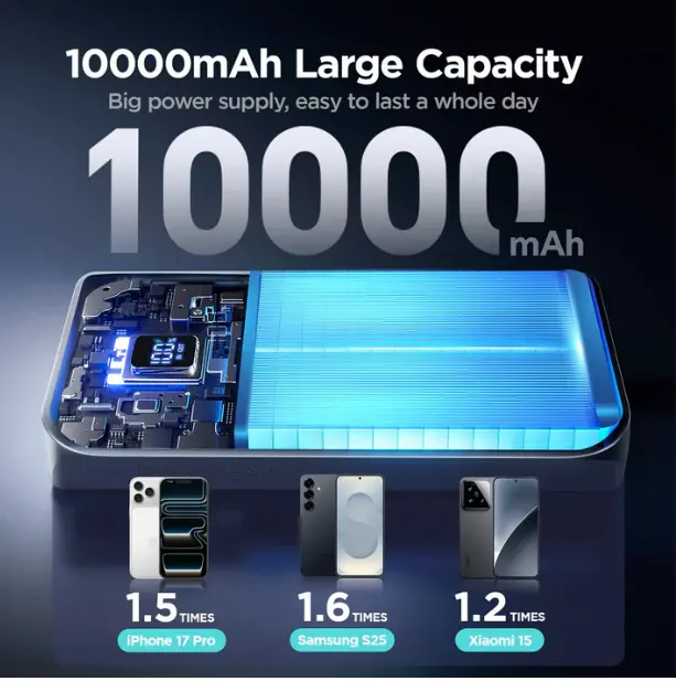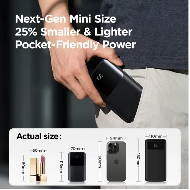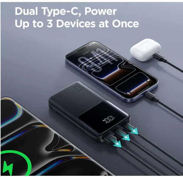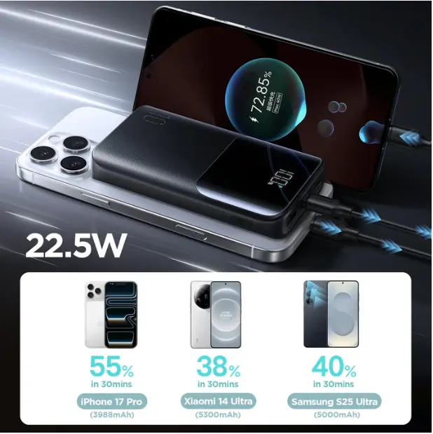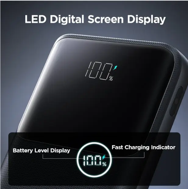 Mini & Lightweight, 10,000mAh Power – Compact size, charges iPhone 16 up to 2×*22.5W Fast Charging Output – Power up your devices quickly and efficientlyDual USB-C In & Out – One cable for fast charging and fast rechargingCharge 3 Devices at Once – Supports phones, tablets & accessoriesLow-Current Mode + Smart Temperature Control – Safe for earbuds, watches & small devicesSmart LED Display – Real-time battery level at a glance