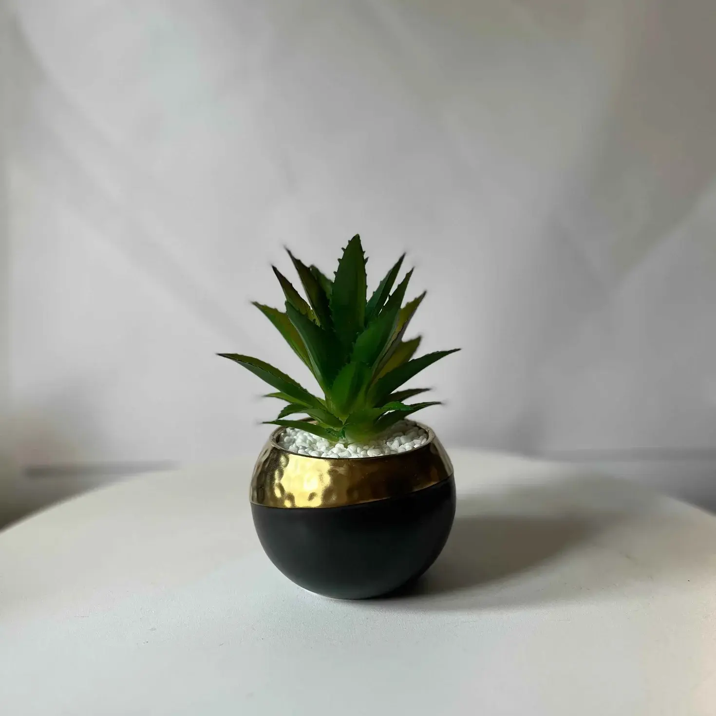 A small and stylish piece that adds a fresh touch to any space. The black and gold pot gives it a modern look, while the green artificial plant brings life to the room — no watering needed.