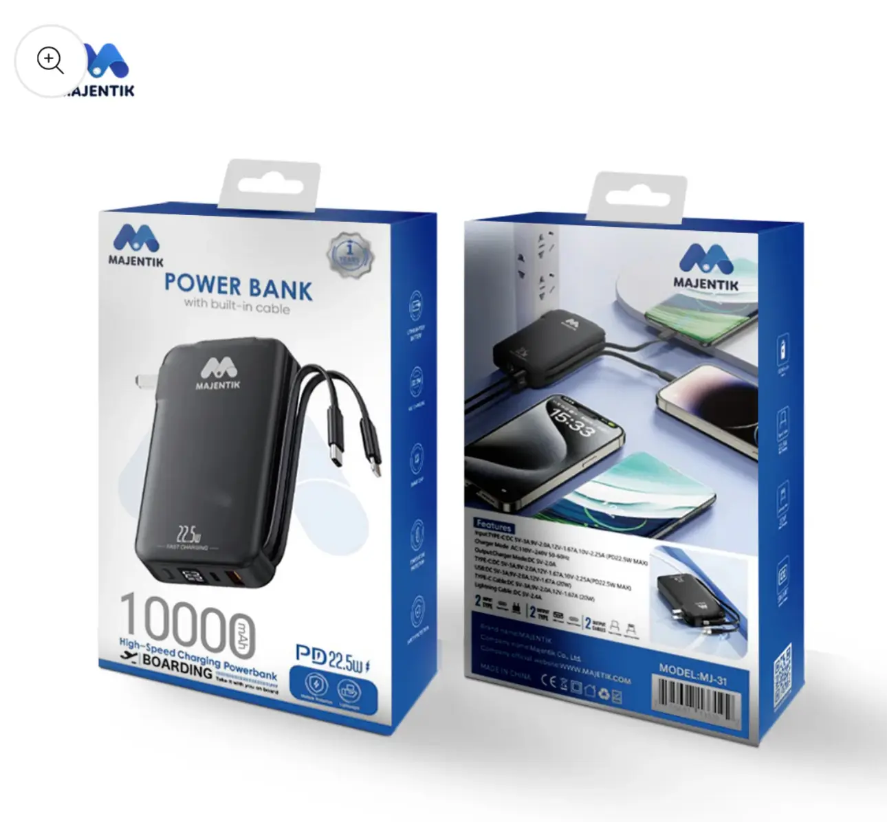 MAJENTIK 10000mAh Power Bank with Built-in Cables – Model MJ-31