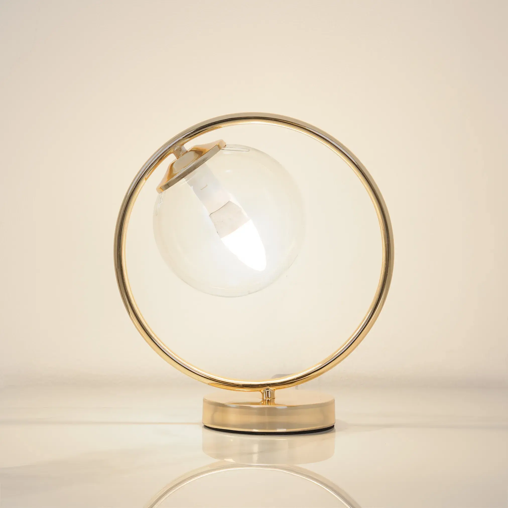 Base: A sturdy, stable circular base in the same lustrous gold finish, designed with a proportionate size to ensure the lamp remains stable on various surfaces (side tables, desks, or consoles).