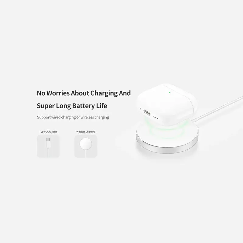 تصميمها نصف داخل الأذن يمنحك راحة فائقة أثناء الاستخدام الطويل، مع تحكم باللمس لتغيير الأغاني أو الرد على المكالمات بسهولة. تأتي مع علبة شحن لاسلكية بسعة 250 مللي أمبير توفر شحنًا سريعًا وأداءً مستمرًا يصل إلى 4 ساعات من الموسيقى و10 أشهر في وضع الاستعداد.