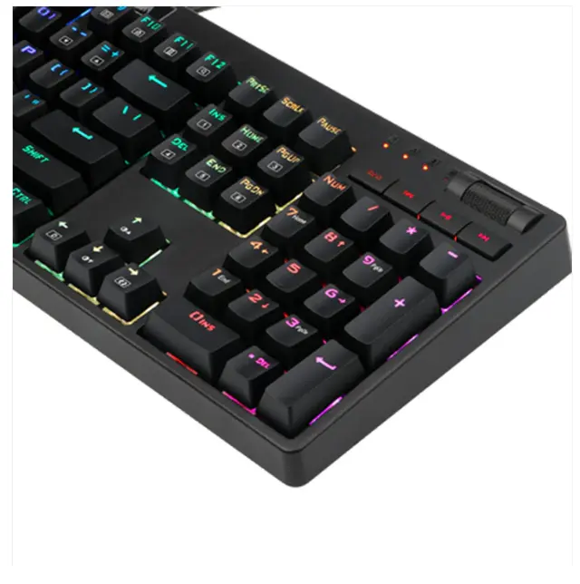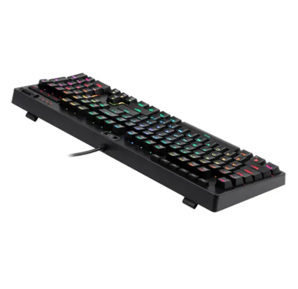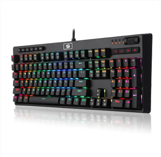 The Redragon K579 RGB is loaded with features such as user programmable Macro Keys, dedicated Volume Control Wheel extremely durable ABS construction, plate mounted keys, double-shot injection moulded keycaps, fast high-end switches with mechanical ultra-last springs, (Cherry BLUE equivalent) crisp and bright adjustable RGB LED backlighting, a gold-plated USB connector for a reliable connection, and a splash-resistant design