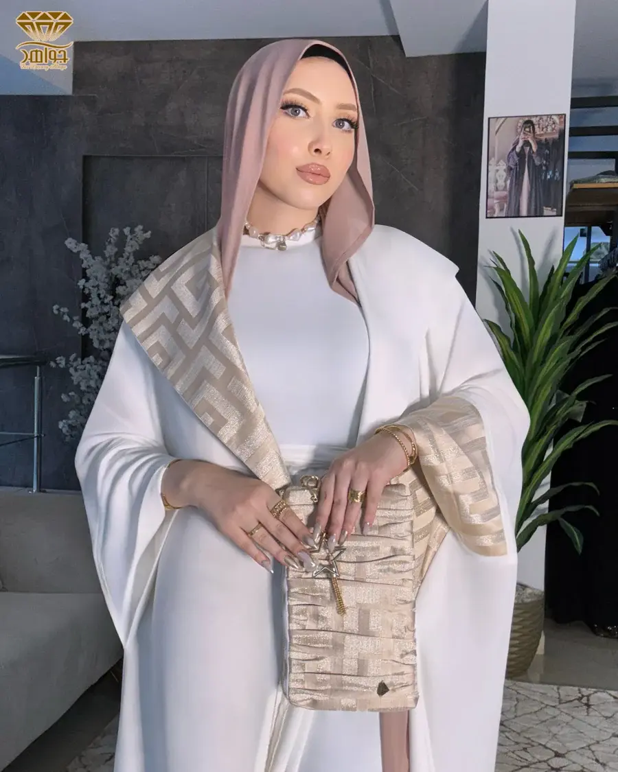 عباية بتصميم مميز بخامة برلين أبيض مستورد بإضافة كم ولياقة بخامة فخمة چاكار مستورد.