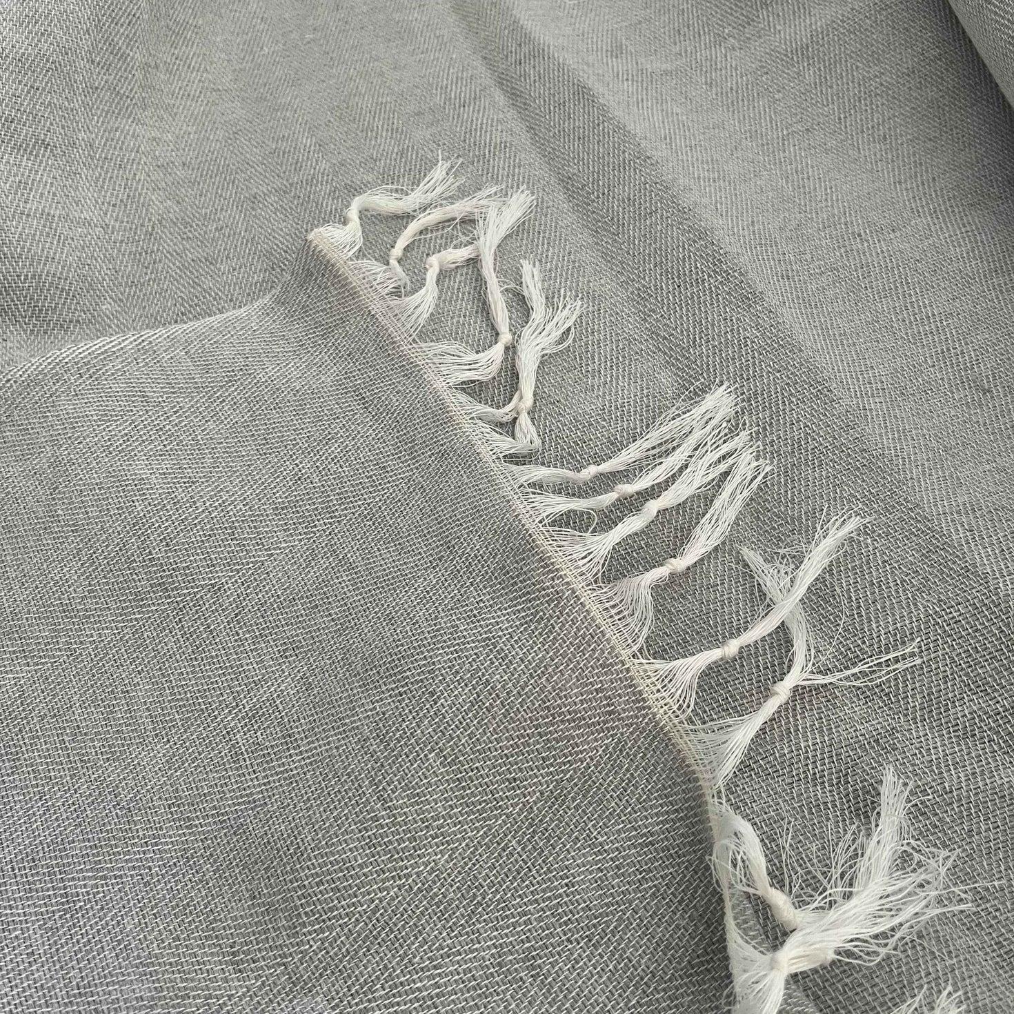 A refined woven throw in a cool mist-grey tone, featuring a subtle chevron pattern that adds depth and texture to your living space. Finished with hand-twisted cream fringes for a touch of softness and contrast, it blends timeless design with everyday comfort. Perfect for draping over a sofa, bed, or lounge to elevate your space with understated elegance.