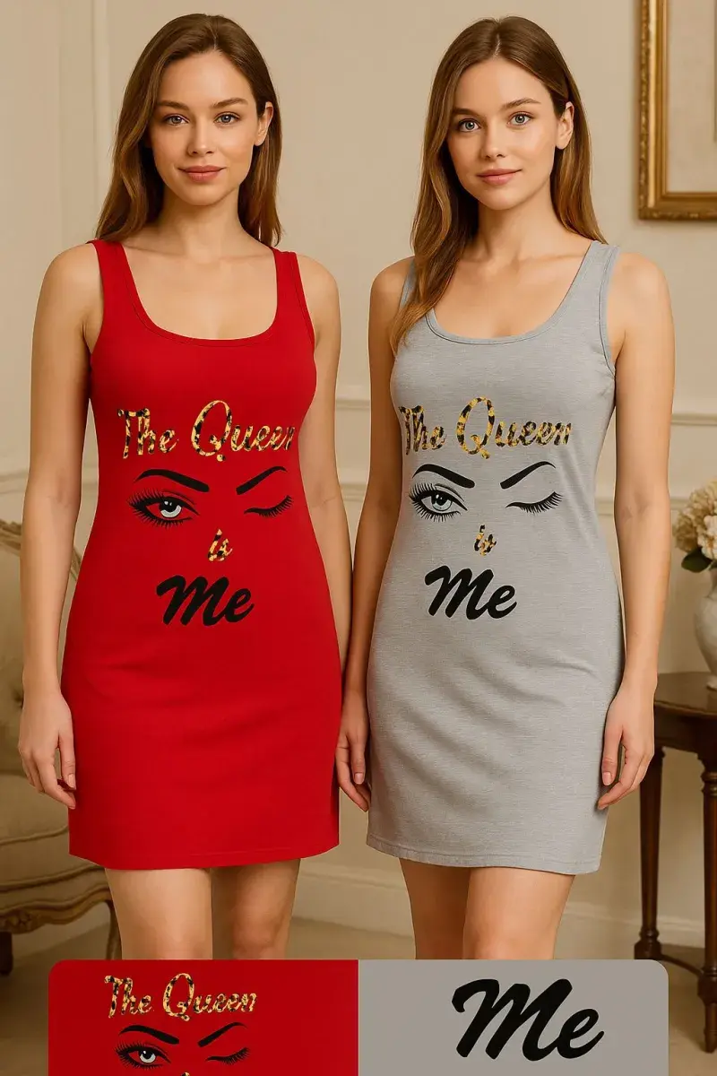 Double the style with this chic 2-piece nightdress set, featuring one in bold red and another in classic grey. Both designs come with a trendy front print that says “The Queen is Me” with eye-catching graphics. Made from soft, breathable fabric, these sleeveless nightdresses are perfect for ultimate comfort and confidence whether at home or bedtime