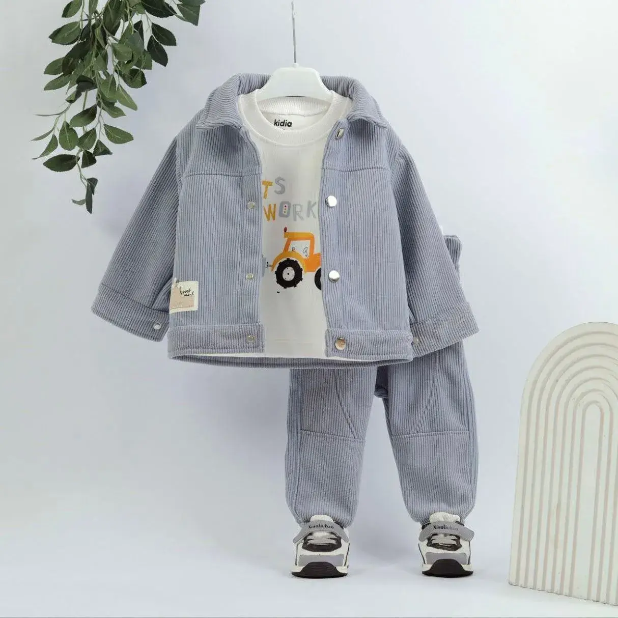 طقم خروجي 3 قطع اولادي قطيفة مضلع عربية جرار رصاصي كيدي