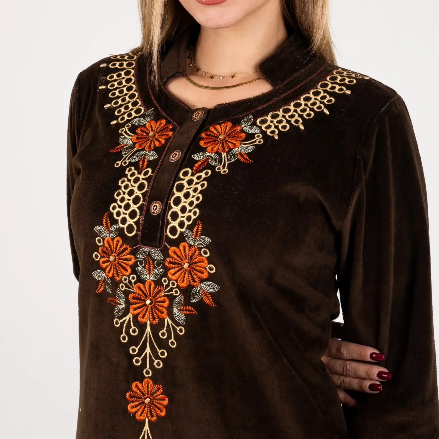 • إذا كانت العباية تحتوي تفاصيل جلدية: امسحي الجلد بقماش جاف فقط دون غمره بالماء.