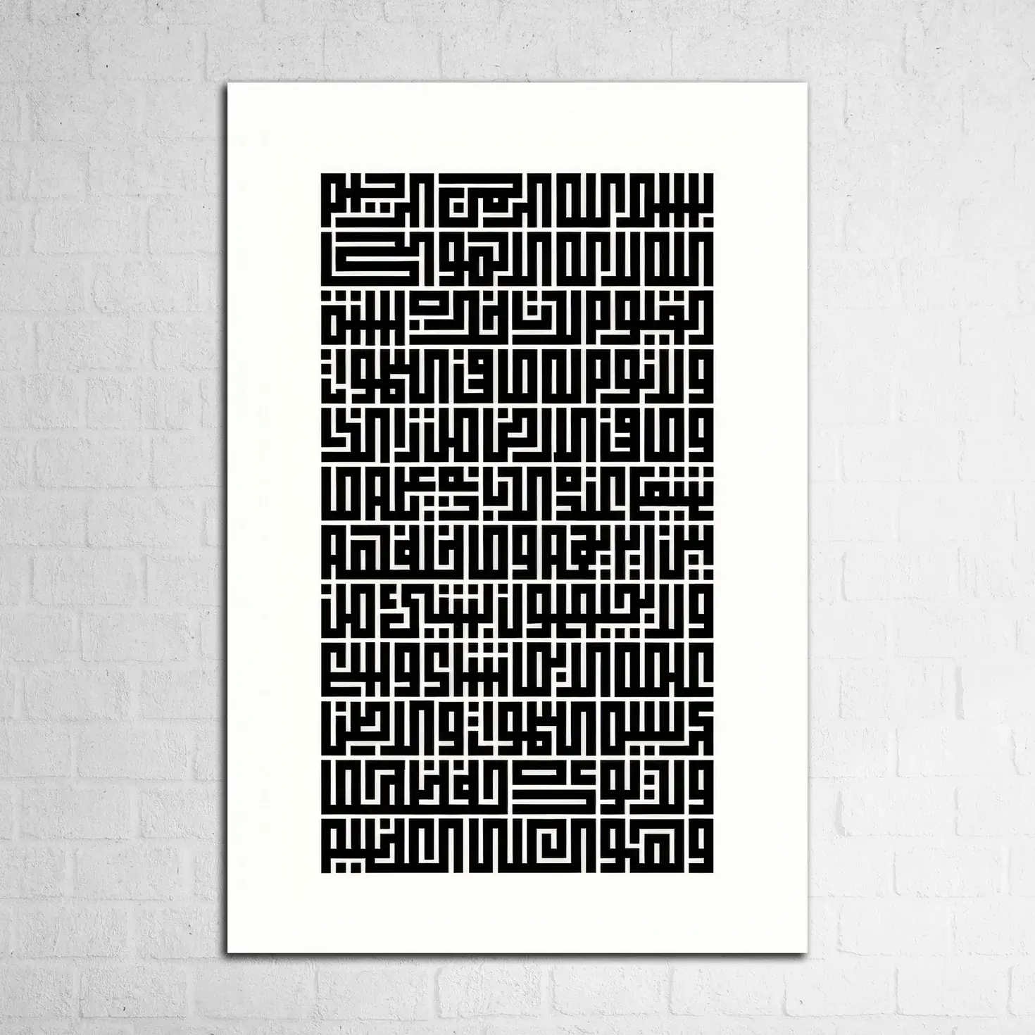 A powerful artistic rendering of Ayat Al Kursi, presented in a bold geometric calligraphy style that merges spiritual depth with contemporary design. The intricate composition reflects strength, protection, and serenity, making it a meaningful statement piece for modern living spaces, offices, or prayer areas. Its clean contrast and structured form allow the sacred verse to stand out with timeless elegance.
